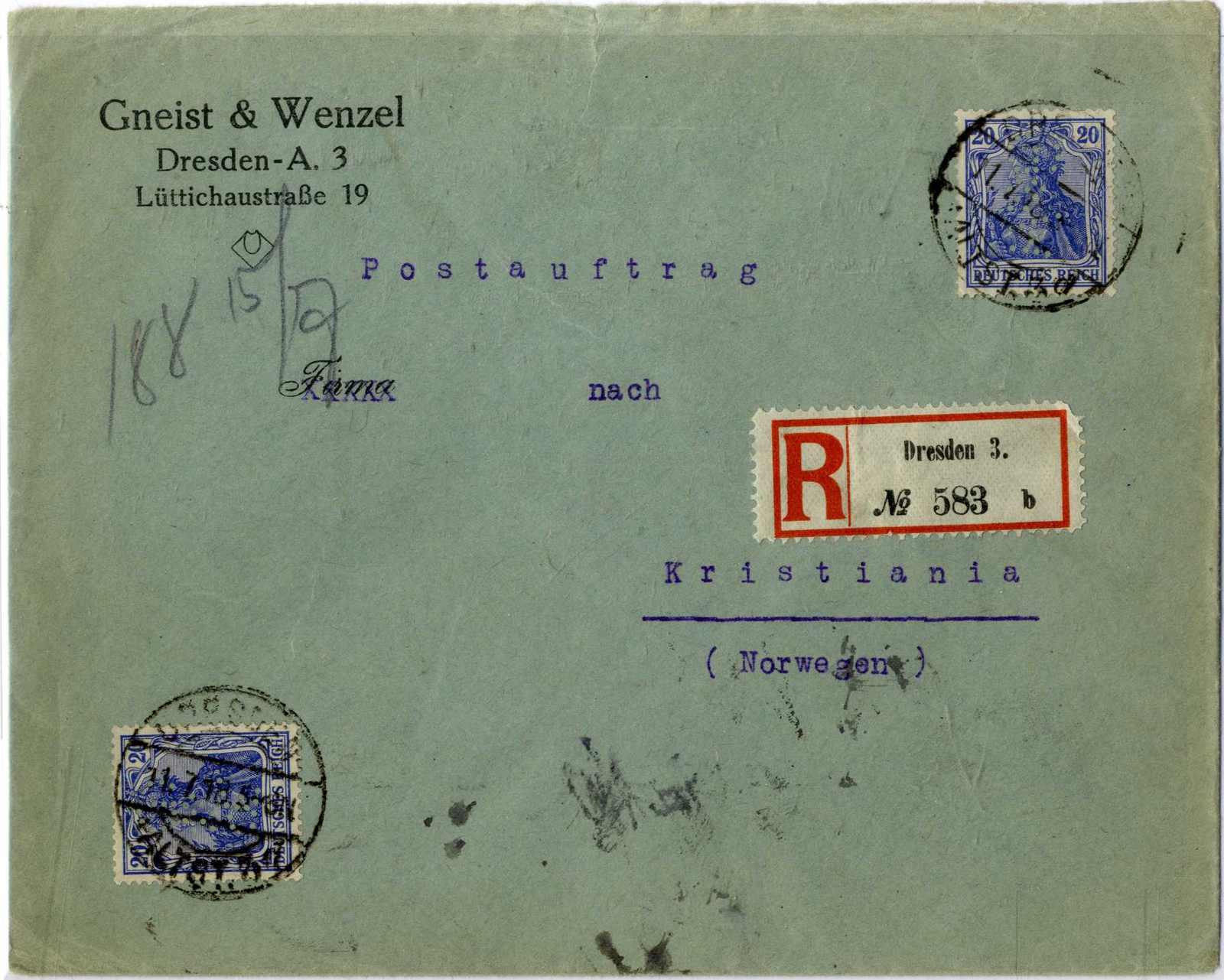 Nr. 38252 - 87 (2) - DRESDEN ALTST. 3 / 31.7.18, Postauftrag nach Norwegen mit 2 x 20 Pf. Germania mit Lochung "G. & W." (Gneist & Wenzel) als Firmenumschlag mit rs. Verschluß-Siegelmarke des PA Dresden 3