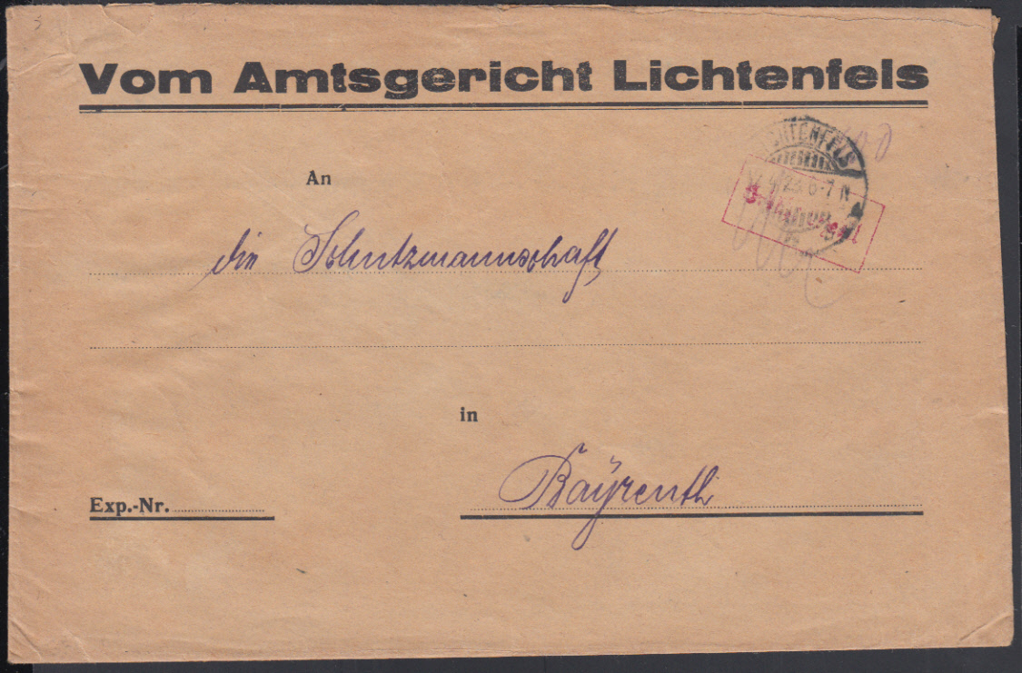 | Nr. 37909 - GAP 120, 120 - "K. BAY. STS. EISENB. / EITENSHEIM / 24 AUG 21 V_Nm", zwei blaue R3 (bekannt seit 1916) als Entwerter auf GA 30 Pf. Germania mit Zusatz 10 Pf. Bayern Abschied | ||