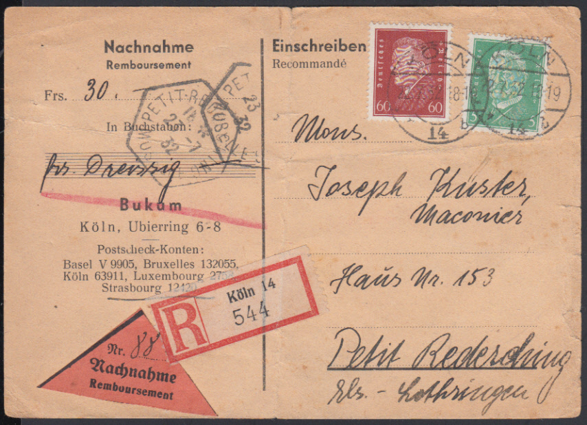Nr. 38373 - Kte411, 421 - KÖLN 14 / 22.7.32, Auslands-NN-Karte nach Frankreich mit 5 und 60 Pf. Reichspräsidenten (für Karte 15, NN 40 und 30 Frs. 10 Pf.), Porto für Einschreiben wohl vergessen, Mittelfaltung und Randmängel