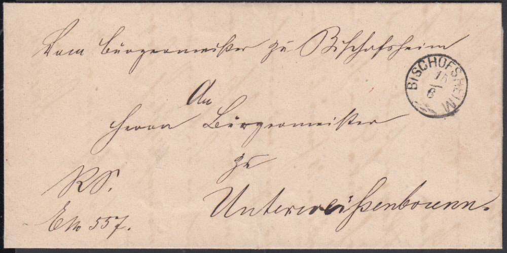 Nr. 38378 - - BISCHOFSHEIM / 15.6., klarer schwarzer Zierstempel mit Zierstücken auf Dienstbrief nach Unterweißenbrunn, auch im Inhalt leider keine Jahreszahl angegeben