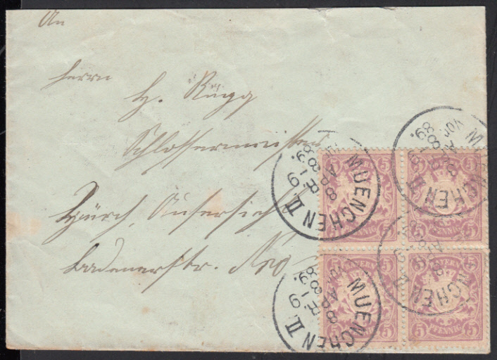 Nr. 38222 - 55 B a VB - 5 Pf. Wappen lila mit Wz. waager. Wellenlinien, Viererblock auf Auslandsbrief ab MUENCHEN II / 8.4.89 nach Zürich