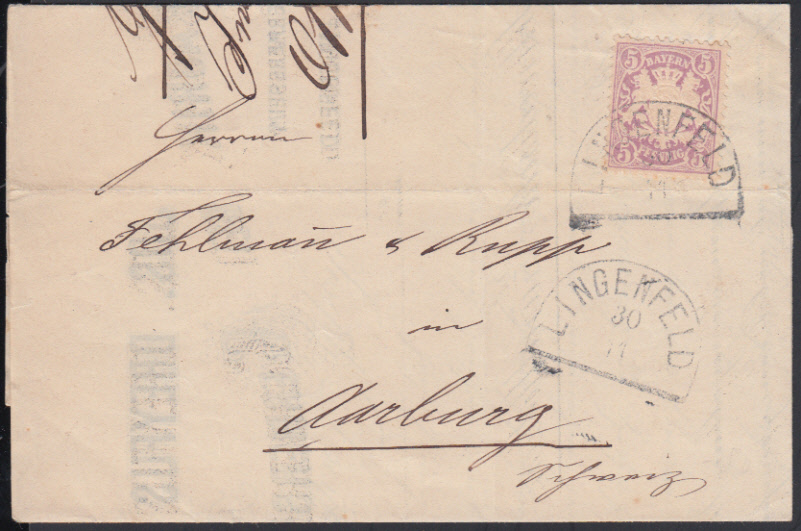 Nr. 38293 - DS45a - 5 Pf. lila Wz. weite Welle auf innen gedruckter Firmenwerbung der Zündholzfabrik Dreyfus als Faltdrucksache in die CH mit zwei Segmentstempeln LINGENFELD / 30.11. (1880)