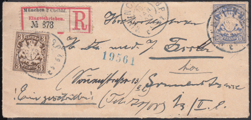 Nr. 38296 - 57 B y, 60 y - MUENCHEN 2 B.P. / 19.1.03, eingeschriebener Ortsbrief zum Tarif 23 Pf. mit 3 und 20 Pf. Wappen