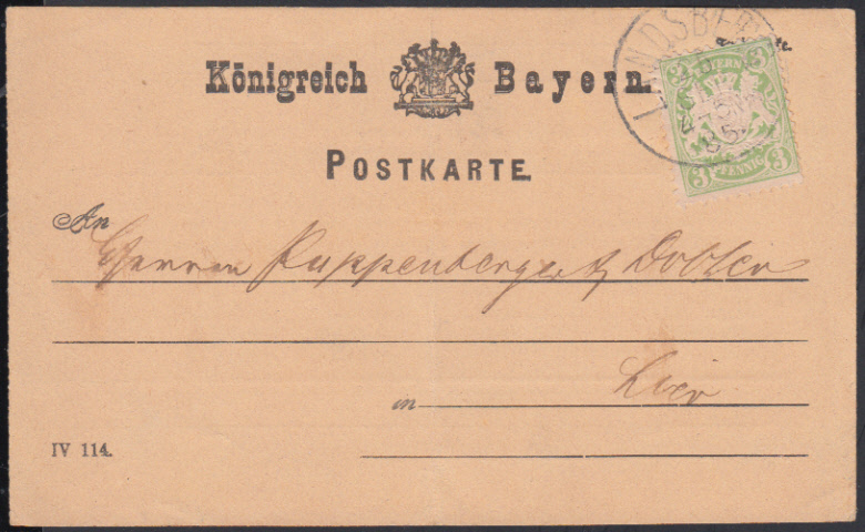 Nr. 23876 - Kte45a - 5 Pf. lila Wz. weite Welle auf Geschäftskarte (rs. Vordruck) mit K1 SPEYER / 27.4. (1881) (Mi. 120 €)