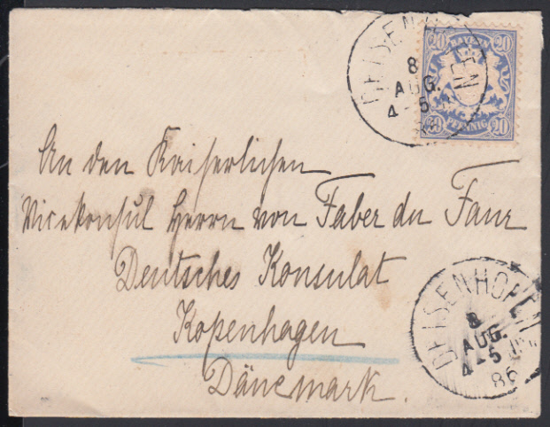 Nr. 38699 - 50 - 20 Pf. Wappen Wz.senkr. Welle mit K1 DEISENHOFEN / 8.8.86 auf kleinem Brief "An den Kaiserlichen Vicekonsul Herrn von Faber du Faur / Deutsches Konsulat / Kopenhagen / Dänemark"