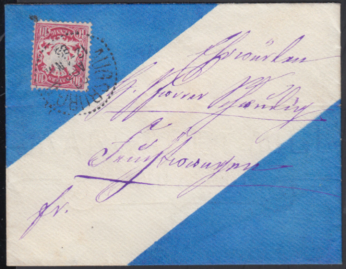 Nr. 36990 - ZU50 - STRAUBING / 5.6. (1882), K1 auf 20 Pf. Wappen senkr. Welle auf dunkelblauer Post-Zustellungsurkunde nach Rain "Porto von Holzapfel Michael in Rain zu bezahlen"