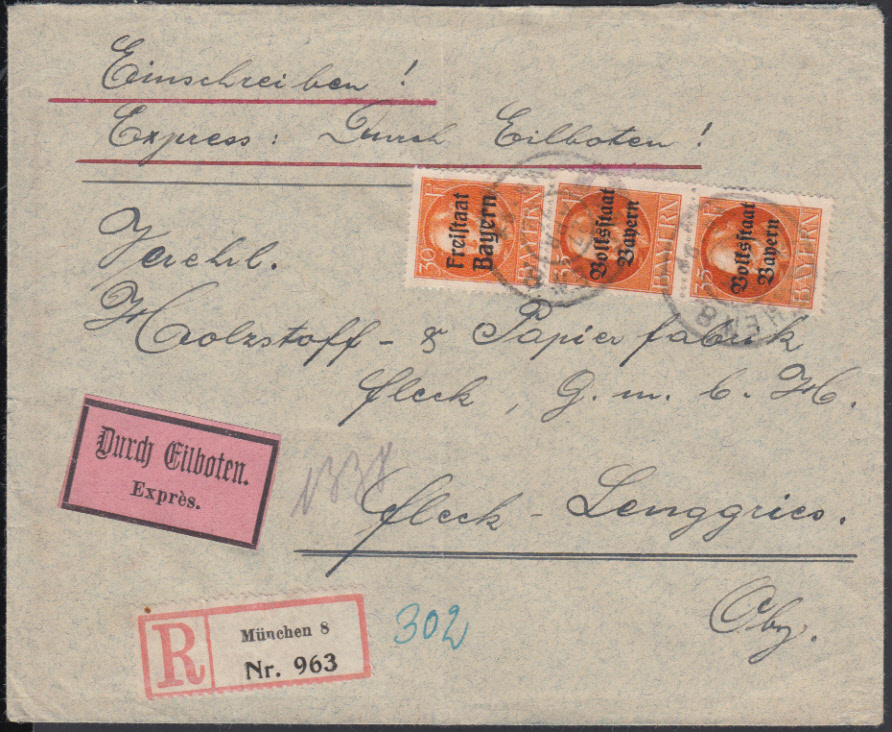 Nr. 38359 - 134 (2), 159 - MÜNCHEN 8 / 27.4.20, Eil-Ebf. nach Fleck bei Lenggries mit senkr. Paar 35 Pf. Ludwig Volksstaat und 30 Pf. Ludwig Freistaat, ohne Landbestellgebühr, senkr. Mittelfaltung