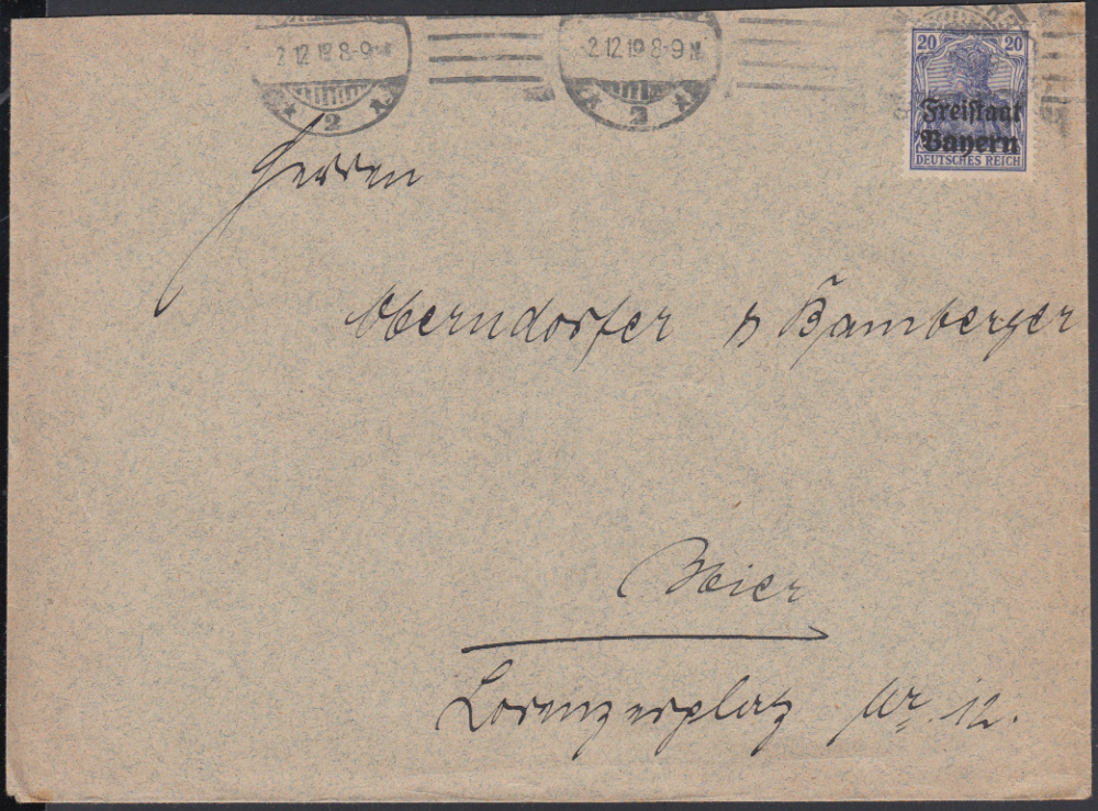 Nr. 38485 - 142 - 20 Pf. Germania Freistaat in nicht häufiger Darstellung einzeln auf portor. Orts-Doppelbrief mit Masch.Stpl. NÜRNBERG 2 / 2.12.19