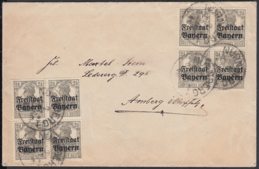 Nr. 38696 - 136 (8) - 2 1/2 Pf. Germania Freistaat, zwei Viererblöcke auf portor. Brief ab NÜRNBERG 1 / 7.10.19