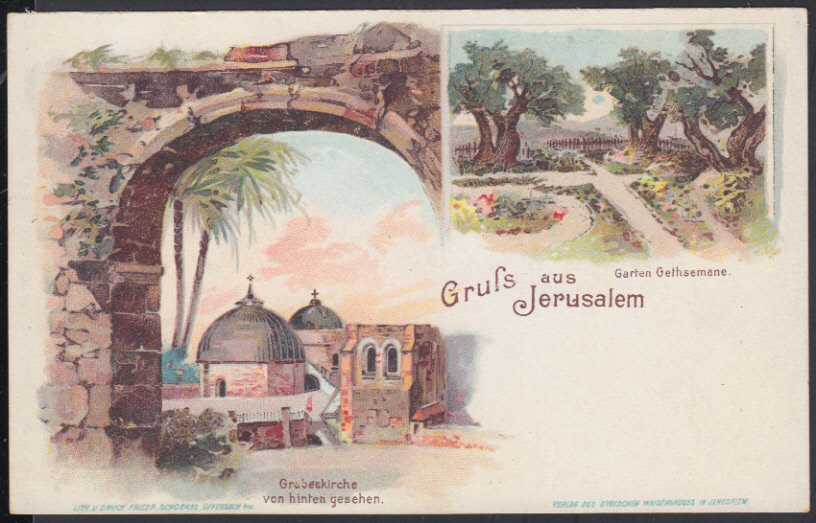 Nr. 38702 - AK - "Gruss aus Jerusalem", ungebr. Farblitho des "Verlag des syrischen Waisenhauses" mit Grabeskirche und Garten Gethsemane