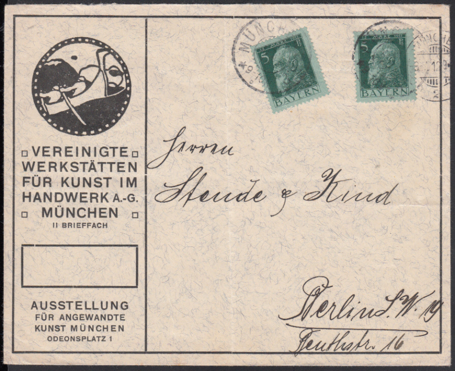 Nr. 38096 - 77 II (2) - MÜNCHEN 2 BP / 3.5.12, 2 x 5 Pf. Luitpold auf dekor. Umschlag "Vereinigte Werkstätten für Kunst im Handwerk A.-G- München" von der Ausst: für angewandte Kunst mit Logo von Bruno Paul