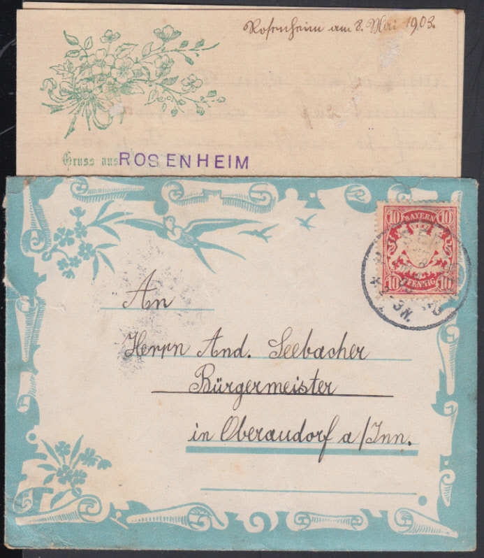Nr. 38533 - 56 - ROSENHEIM 2 / 8.5.03, 10 Pf. Wappen auf ganzflächigem hellblauem Zierumschlag nach Oberaudorf, Inhalt ("Liebe Eltern") inliegend, hübsch