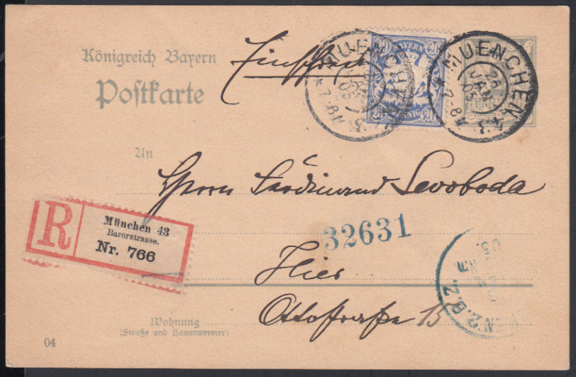 Nr. 38291 - GAP 65/02, 57 B - 2 Pf. Ziffer auf Raute, GA mit Zusatz 20 Pf. Wappen als Bedarfs-Orts-Einschreibkarte mit K2 MUENCHEN 43 / 26.1.05, in Verbindung mit Ganzsache sehr seltenes 22 Pf.-Porto
