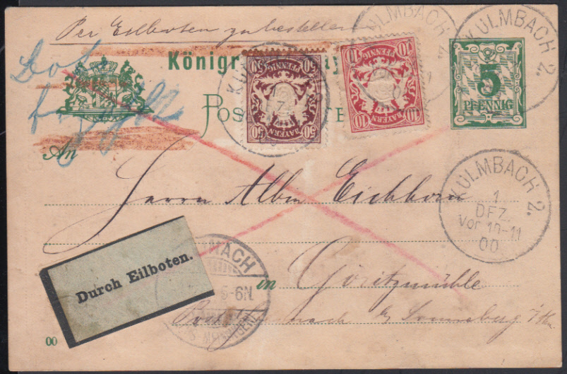 Nr. 38292 - GAP 50/01,56,63 - 5 Pf. Ziffer auf Raute, GA mit Zusatz 10 und 50 Pf. Wappen als portor. Eilkarte in den Landbestellbezirk von Steinach in Thüringen ab KULMBACH 2 / 1.12.00, Karte fleckig und vergilbt, als GA selten