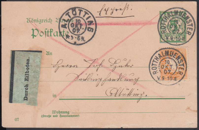 Nr. 38421 - GAP 66/05, 62y - 5 Pf. Ziffer auf Raute, GA mit Zusatz 25 Pf. Wappen als Eilkarte mit grünem Zettel und 2 klaren K2 ROTTHALMÜNSTER / 10.10.07 nach Altötting, Zettel fleckig und Randmangel unten mittig