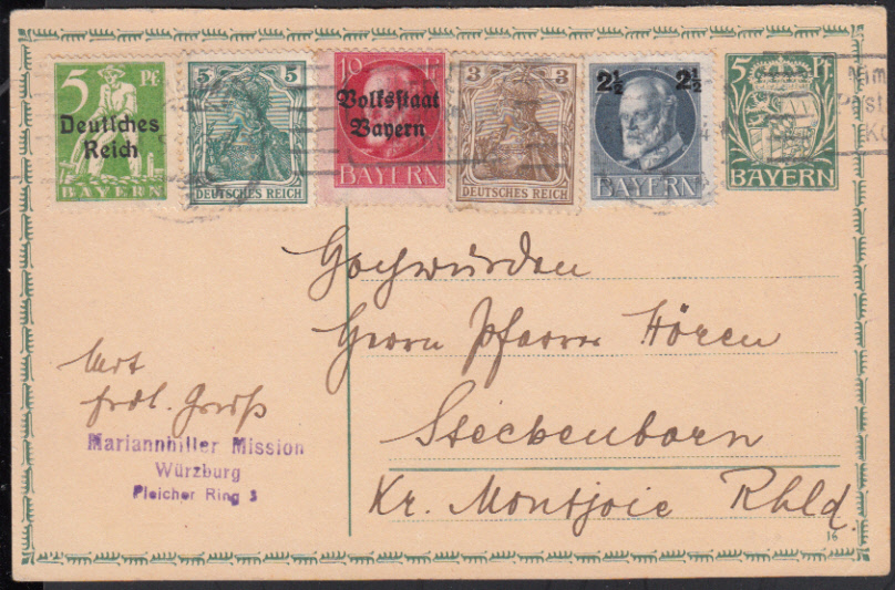 Nr. 38106 - GAP 93 I / 03 - WÜRZBURG 2 / 31.5.20, Maschinen-Bandstempel "Postscheck- Konto" auf GA 5 Pf. Huppsches Wappen mit Zusatz von drei Bayern- und zwei Germania-Marken (total 30,5 Pf.) im späten Aufbrauch