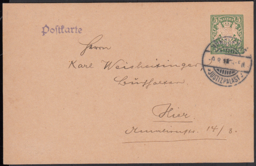 Nr. 38166 - GAPP 15 A 1 - 5 Pf. Wappen, Blankokarte ohne Vordruck, mit Gummistempel "Postkarte", im Ortsverkehr mit Steg-K1 MÜNCHEN 35 / JUSTIZPALAST / 9.8.11