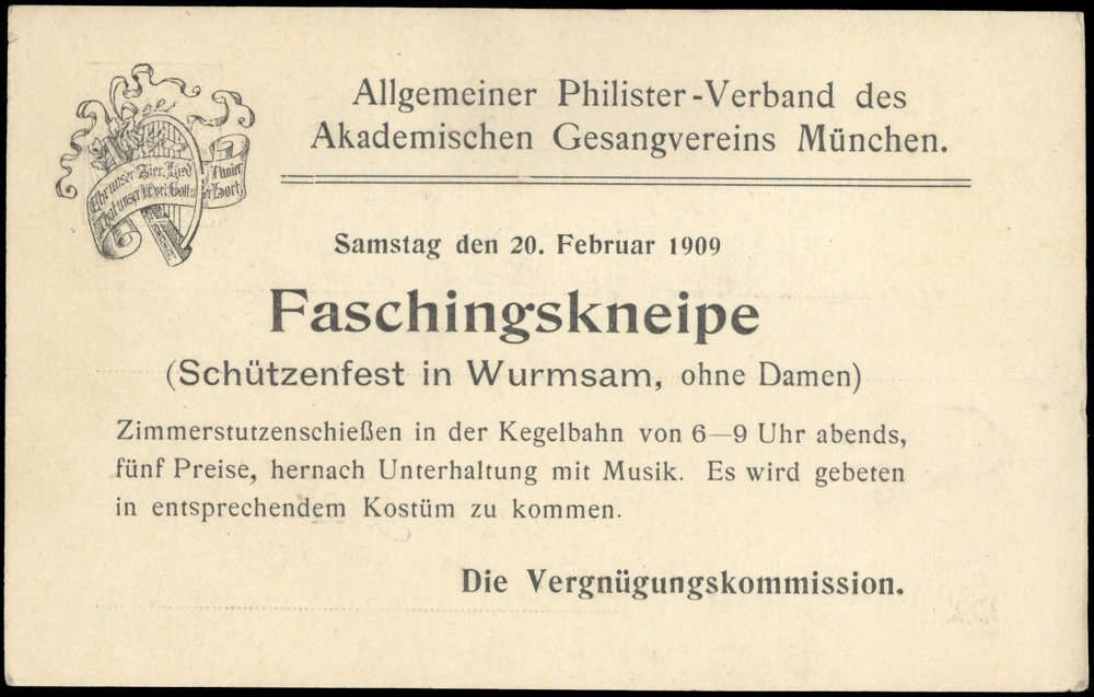 Nr. 38253 - GAPP 11 B4/01 - 3 Pf. Wappen, Privat-DS-Karte "München, Allg. Philister-Verband des Akad. Gesangvereins" mit rs. Einladung zur Faschingskneipe am 20.2.09, mit K2 MÜNCHEN 1 BP / 16.2.09, rs. Name übermalt