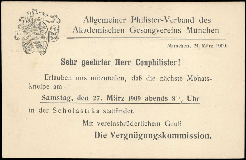 Nr. 38254 - GAPP 11 B4/02 - 3 Pf. Wappen, Privat-DS-Karte "München, Allg. Philister-Verband des Akad. Gesangvereins" mit rs. Einladung zur Philister-Monatskneipe am 27.3.09, mit K1 MUENCHEN 1 BP / 24.3.09, rs. Teil der Anschrift überklebt