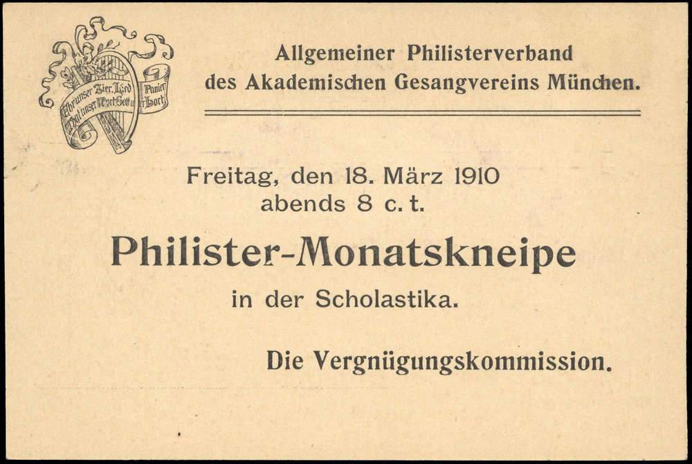 Nr. 38255 - GAPP 11 B4/010 - 3 Pf. Wappen, Privat-DS-Karte "München, Allg. Philister-Verband des Akad. Gesangvereins" mit rs. Einladung zur Philister-Monatskneipe am 18. März 1910, mit Masch.Stpl. MÜNCHEN 1 /14.3.10, Name überklebt