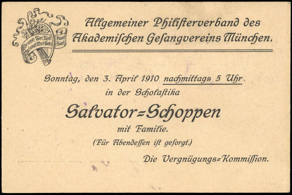 Nr. 38256 - GAPP 11 B4/11 - 3 Pf. Wappen, Privat-DS-Karte "München, Allg. Philister-Verband des Akad. Gesangvereins" mit rs. Einladung zum Salvator-Schoppen am 3.4.10, mit Masch.Stpl. MÜNCHEN 1 / 30.3.10, Teil der Anschrift überklebt