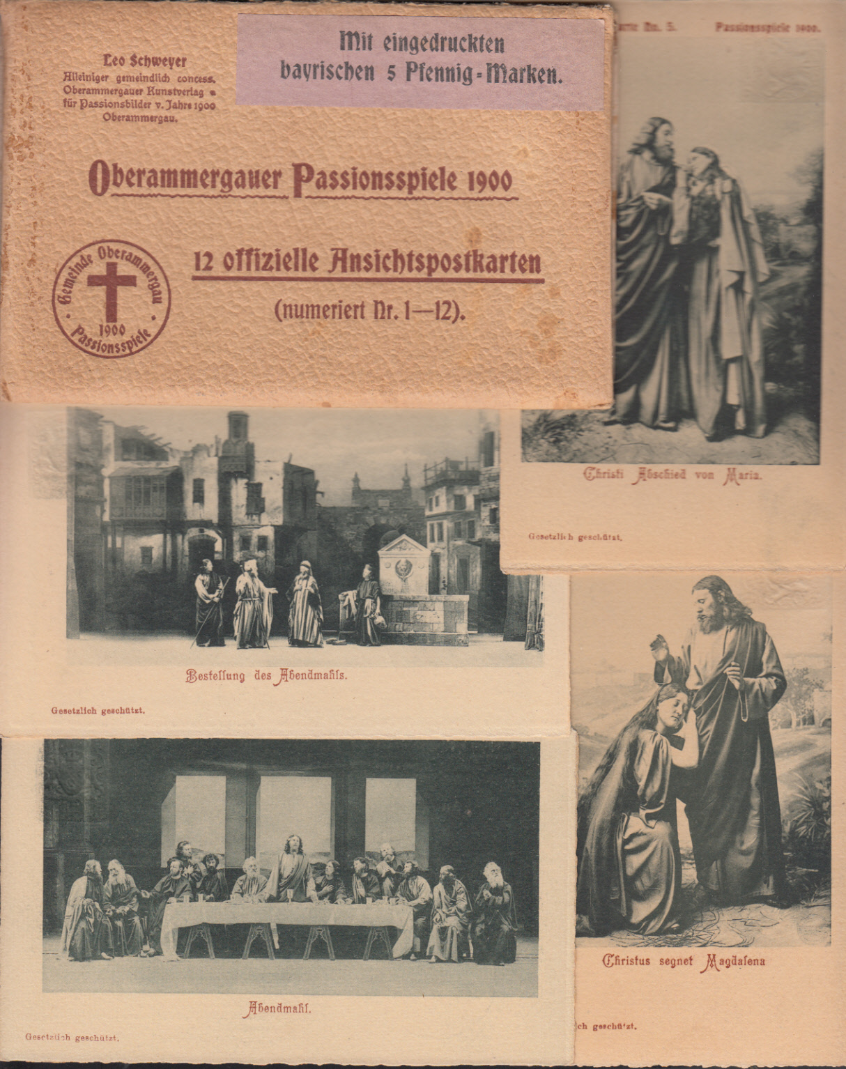 Nr. 38158 - 12GAPP 15 C29 - 5 Pf. Wappen, Passionsspiele Oberammergau 1900, kpl. Satz von 12 ungebrauchten PrivatGA mit untersch.Typen von "Postkarte" (Nr. 5 in Type III; Rest in Type I), Verkaufshülle beiliegend