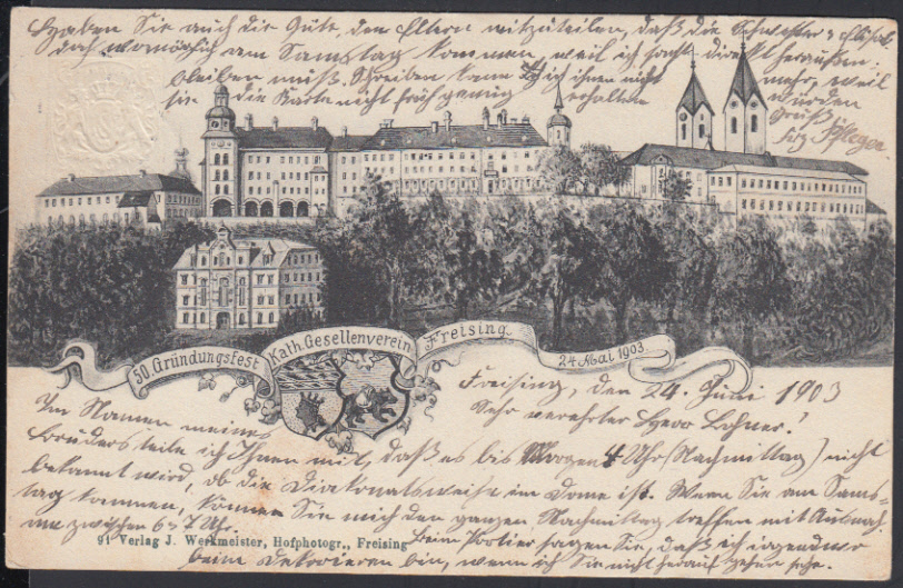 Nr. 24160 - GAPP 15 C48/02 - 5 Pf. Wappen, PrivatGA zum "50. Gründungsfest Kath. Gesellenverein Freising 24. Mai 1903" mit schwarzem Bild des Freisinger Klosters, gebr. mit K1 FREISING 1 / 24.5.03, links 4 mm Randspalt
