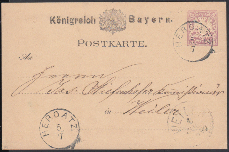 Nr. 38458 - GAP 18 - HERGATZ / 5.7. (1881), Schwaben-Einkreisstempel ohne Jahreszahl (Typ 26a) 2 x klar auf GA 5 Pf. Wappen violett
