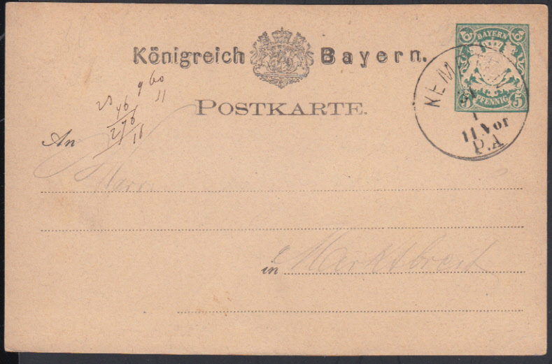 Nr. 38532 - GAP 8 - KEMPTEN / 31 1 11 Vor / P.A., seltener K1 für Postanweisungen als Entwerter auf GA 5 Pf. Wappen grün (ca. 1877)