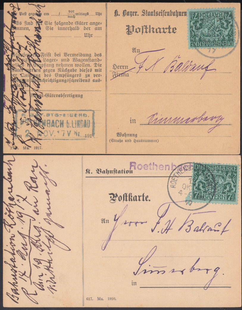 Nr. 38299 - 2 KtD 18 - K. BAY. STS-EISENB. / RÖTHENBACH b. LINDAU / 2.NOV.17, R3 als Absenderstempel vs. auf Güterbenachrichtigungskarte, dazu Karte mit viol. L1 (K. Bahnstation) "Roethenbach b. Li."