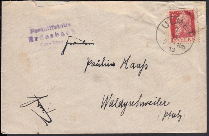 Nr. 38146 - 77 II - Erdesbach / Taxe Ulmet, viol. R3 unsauber auf Brief mit 10 Pf. Luitpold (Heftchenmarke ohne Zähnung oben) und K1 ULMET / 7.11.13, Umschlag mit Randmängeln