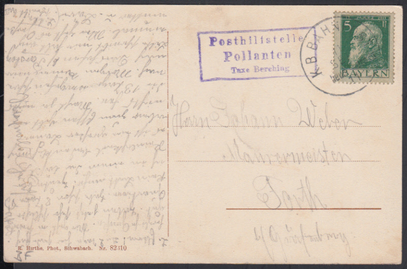 Nr. 38705 - AK77 II - Pollanten / Taxe Berching, klarer viol. R3 auf entspr. 3-Bild-AK mit 5 Pf. Luitpold und seltenem BP-K1 Neum Dietf / 11.9.11