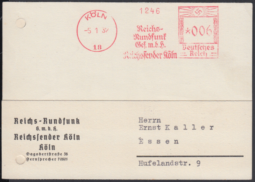 Nr. 38515 - Kte - KÖLN 18 / 5.1.37, "Reichs-Rundfunk Ges.m.b.H. / Reichssender Köln", Absenderfreistempel mit Wertrahmen Hakenkreuz auf Vordruck- karte (Nachholung einer ausgef. Sendung), Aktenlochung geschlossen