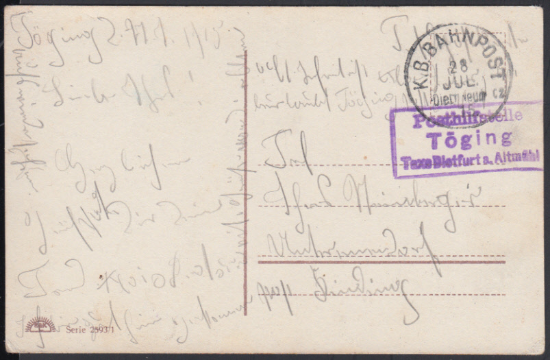 Nr. 38643 - AK - Töging / Taxe Dietfurt a. Altmühl, sehr klarer viol. R3 in später Type 2 auf FP-Kitschkarte mit BP-K1 Diet Neum C2 / 28.7.15