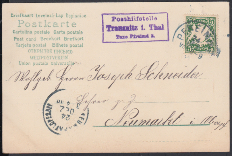 Nr. 38707 - AK61y - Trausnitz i. Thal / Taxe Pfreimd 2, sehr klarer viol. R3 auf Weihnachts-Lithographie mit 5 Pf. Wappen und K1 PFREIMD 1 / 24.12.03