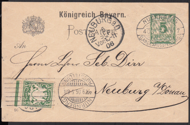 Nr. 38245 - GAP 48, - NÜRNBERG / AUSSTELLUNG / 4.9.06, Bickerdike-Maschinenstempel auf GA der Ausstellung 1896 mit 5 Pf., ehem. blanko gest. NÜRNBERG LANDESAUSSTELLUNG / 4.10.96, jetzt gelaufen nach Neuburg a. D.