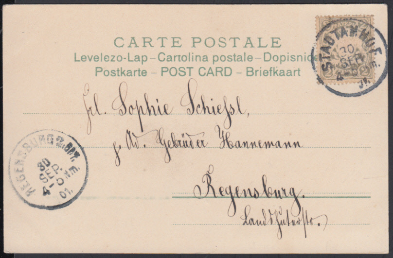 Nr. 38614 - AK65y - STADTAMHOF / 30.9.01, 2 Pf. Wappen auf Glückwunsch-Litho im Nachbarortsverkehr nach Regensburg (Stadtamhof wurde am 1.2.1919 eingemeindet)