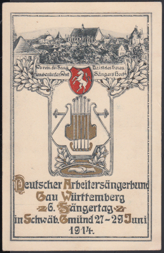 Nr. 38459 - GAPP 27 C26 - 5 Pf. Germania, ungebr. PrivatGA "Deutscher Arbeitersängerbund / 6. Sängertag / in Schwäb. Gmünd 27.-29. Juni 1914", Karte No. 4 mit Ortsansicht und Lyra