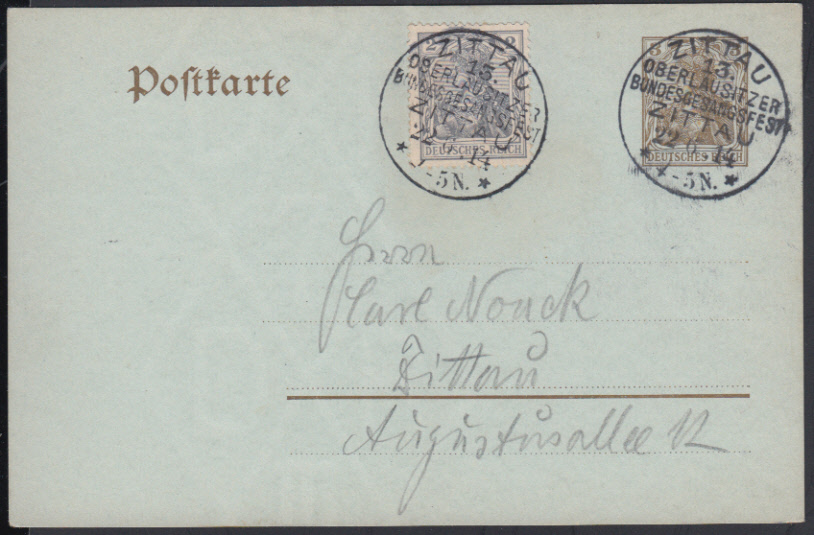 Nr. 38285 - GAP 77, 83 I - ZITTAU / 13. OBERLAUSITZER BUNDESGESANGSFEST ZITTAU / 22.6.14, zwei klare Sonderstempel auf GA 3 Pf. Germania mit Zusatz 2 Pf., Ortskarte ohne Text