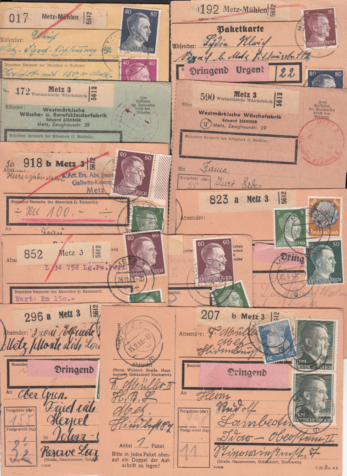 | Nr. 38151 - Pktk - Metz, 12 Paketkarten 1943/44 mit Frankaturen Hindenburg und Hitler, dabei Wert, dringend, Markwerte Hitler, vom PA 3 (8), Metz-Mühlen (2) und 2 Selbstbucher der Westm. Wäschefabrik | ||