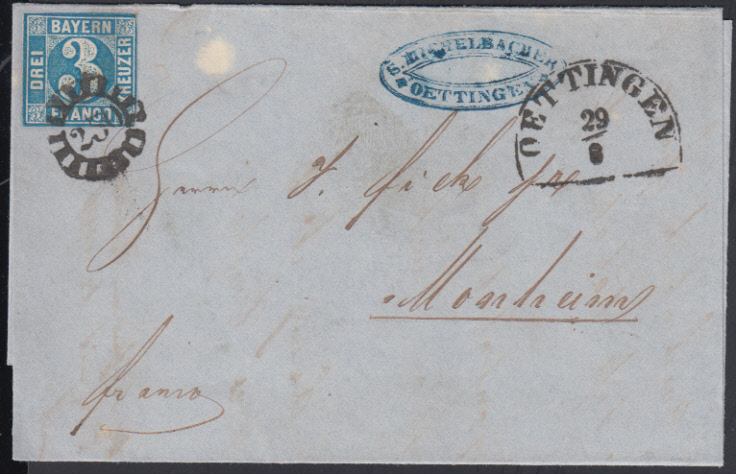 Nr. 38535 - 2 IV - gMr 250 klar auf 3 Kr. blau Pl. IV im Zwergschnitt auf Brief mit innen gedr. Rechnung und Segmentstempel OETTINGEN / 29.8. (1856)