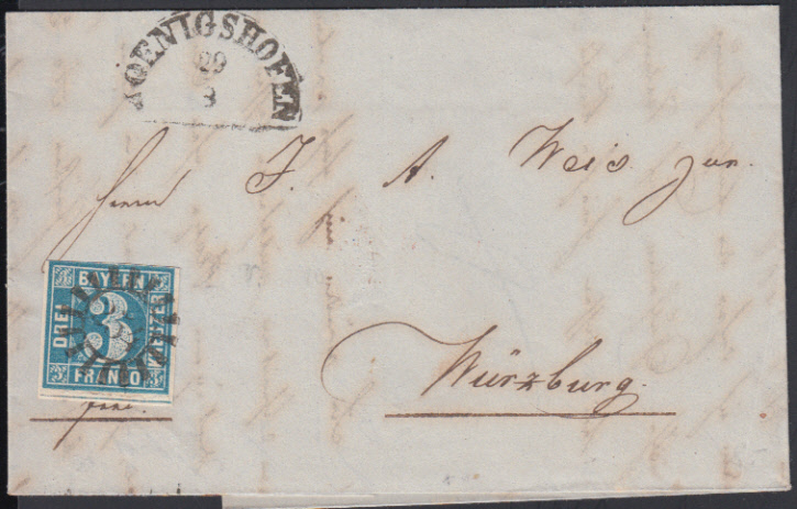Nr. 38536 - 2 - gMr 254 zentrisch auf dreiseitig vollrandiger, oben knapper 3 Kr. blau Pl. III auf Brief mit Segmentstempel KOENIGSHOFEN / 29.8. (1857)