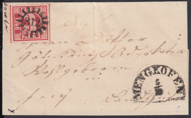 Nr. 38538 - 9 - gMr 312 sehr klar und zentrisch auf breitrandiger 3 Kr. rot vom linken Rand auf Brief mit Segment MENGKOFEN / 5.10. (1866)