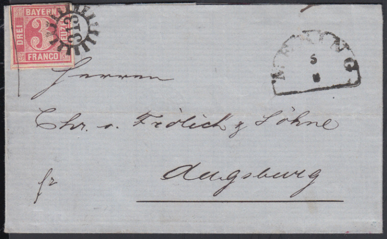 Nr. 36092 - 2 V - gMr 323 als evtl. Vorausentwertung klar auf vollrandiger 3 Kr. blau Pl. V auf kleinem Trauerbrief nach München mit Segmentstempel MÜHLDORF / 24.5. (1861), nicht als Vorausentwertung prüfbar
