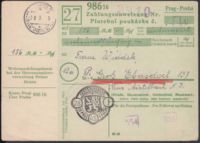 Nr. 38316 - Form - POSTSPARKASSE PRAG / 28.3.45, kleiner K2 auf vorgedruckter Zahlungsanweisung "Heeresstandortverwaltung Brünn" über 156 RM nach Mistelbach / N.D., nicht mehr ausbezahlt