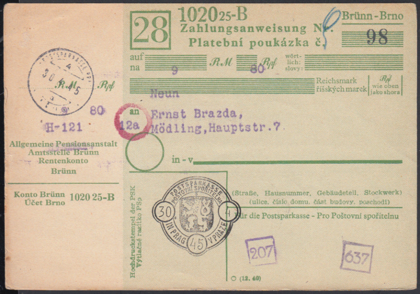 Nr. 38321 - Form - POSTSPARKASSE PRAG / 30.4.45, kleiner K2 auf vorgedruckter Zahlungsanweisung "Pensionsanstalt Brünn" über 9.80 RM nach Mödling bei Wien, natürlich nicht mehr ausbezahlt