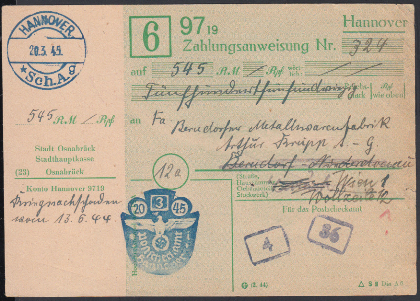 Nr. 38322 - Form - HANNOVER / Sch.A. / 20.3.45, blauer Steg-K1 auf vorgedruckter Zahlungsanweisung "Stadthauptkasse Osnabrück" über 545 RM für "Kriegssachschaden" nach Wien, nicht mehr ausbezahlt
