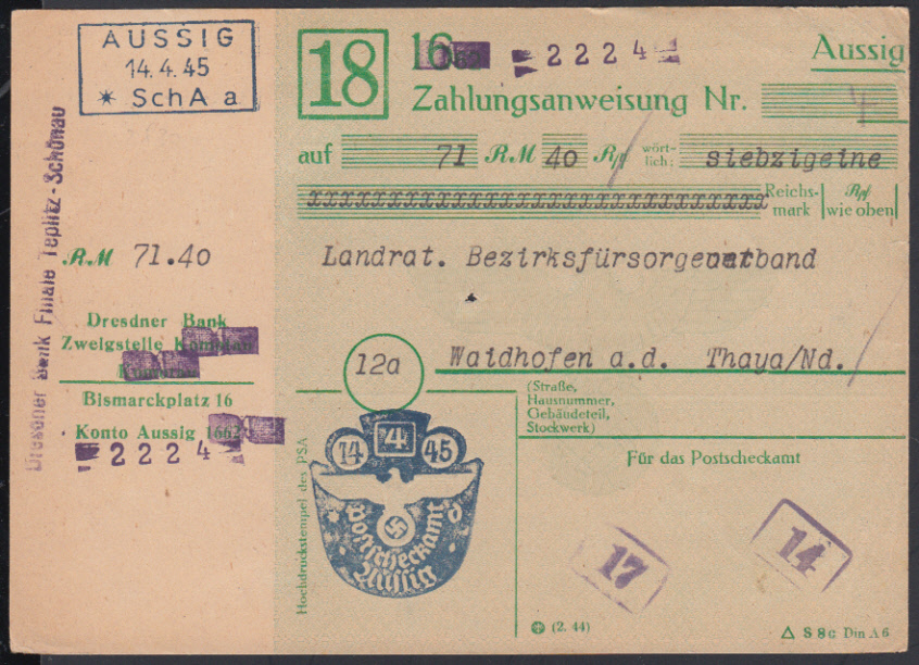 Nr. 38324 - Form - AUSSIG / 14.4.45 / * Sch A a *, viol. R3 auf vorgedruckter Zahlungsanweisung "Dresdner Bank Filiale Teplitz-Schönau" nach Waidhofen an der Thaya, nicht mehr ausbezahlt