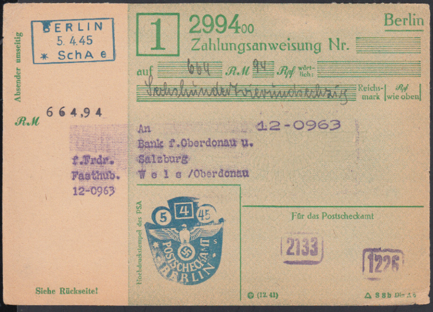 Nr. 38325 - Form - BERLIN / 5.4.45 / * Sch A e, blauer R3 auf vorgedruckter Zahlungsanweisung der "Hauptgebührnisstelle der Luftwaffe" nach Wels / Oberdonau, nicht mehr ausbezahlt