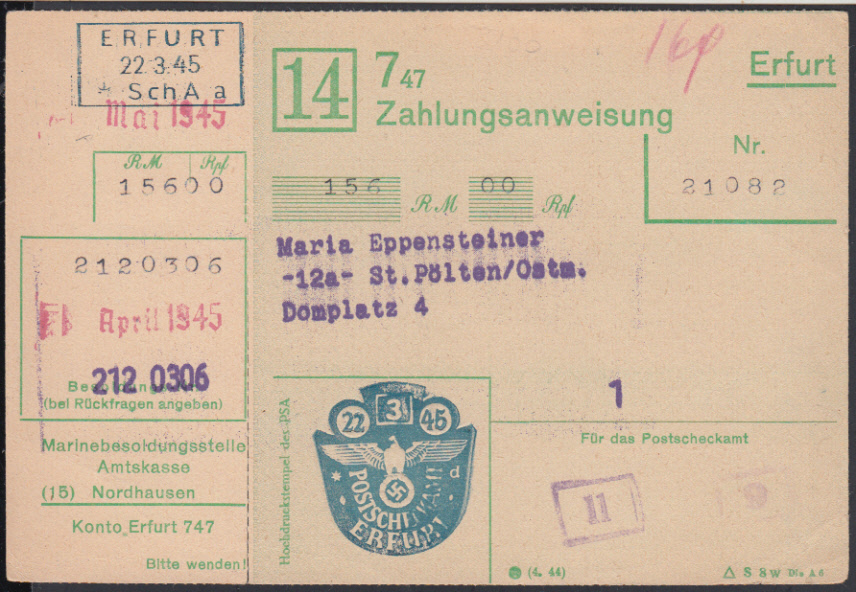 Nr. 38326 - Form - ERFURT / 22.3.45 / * Sch A a, blauer R3 auf vorgedruckter Zahlungsanweisung der "Marinebesoldungsstelle (15) Nordhausen" nach St. Pölten / Ostmark, nicht mehr ausbezahlt
